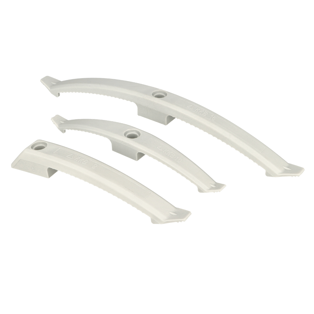 Uchwyty kablowe KKB do tworzenia prostych tras kablowych. Stosowane alternatywnie do kanałów, korytek kablowych. Najczęściej wykorzystywane do prowadzenia kabli nad sufitami podwieszanymi. Uchwyt kablowy szybkiego montażu umożliwia szybkie dokładanie i odejmowanie z tras kablowych przewodów. Mocowane do podłoża za pomocą śrub, kołków rozporowych, gwoździ. Modyfikacja trasy kablowej nie wymaga użycia dodatkowych narzędzi. Sugerowany rozstaw mocowania uchwytów (co 50-60 cm).